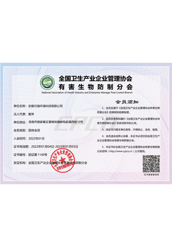 凱瑞蟲控擁有質量管理體系認證、環境管理體系認證、國家有害生物資質等各項證書